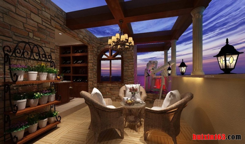本套装修为田园型装修,阳台地面采用的是地板装修,墙面采用墙纸进行装修,吊顶采用地板进行平顶吊顶,加以吊灯做装饰,阳台富有泥土气息的小藤条做成的藤椅以及藤桌,其造型完全可以随心所欲。轻巧大方,那些细密交织的藤条古朴、清爽。透过窗户,每当夜幕降临的时候,天空是泛着光泽的紫水晶,若影若现的云像是上帝呵出的热气,神秘轻盈的蓝天白云天气,心情感觉也很舒畅。营造了一个美轮美奂的空间,散发着无穷的魅力。