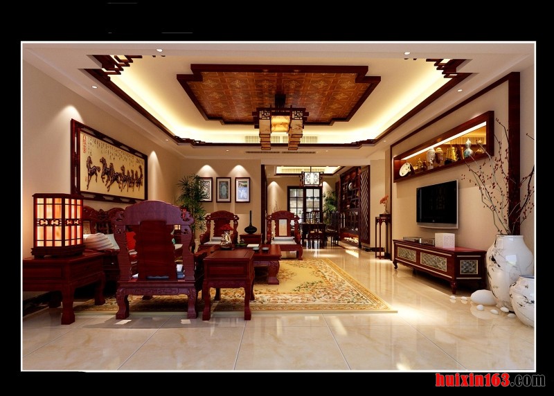 本套装修为中式古典型装修,客厅地面采用地板装修,局部采用的地毯进行装饰,墙面采用的墙纸进行装修,吊顶采用石膏板进行平顶吊顶,加以吊灯进行装饰,客厅采用全木材质材料,古典的沙发,古典的色彩,古典的家,一切都充满古典气息,红木的沙发强烈地暗示着沉稳的性格与富有艺术感的品位。墙上中国古代的汉字油画以及家具,犹如真的古代贵族之家。客厅给人的感觉很大气,像穿越到了古代。