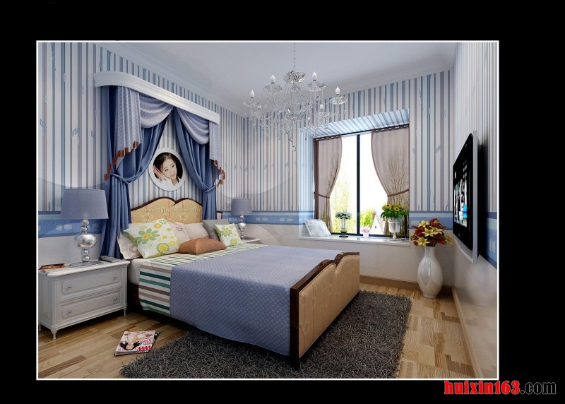 本套装修为现代简约型装修,卧室地面采用地板装修,局部采用的地毯进行装饰,墙面采用的墙纸进行装修,吊顶采用石膏板进行平顶吊顶,加以吊灯进行装饰,白色舒适的床,好像雪花一样的柔柔,床的墙面采用的是蓝色,打造出一种海底世界的感觉,神秘梦幻,窗户边缘有一个地台,很时尚。同时也可以边休息,边看场外的美景,真是一大不错的享受,空间整体给人一种温馨的感觉。