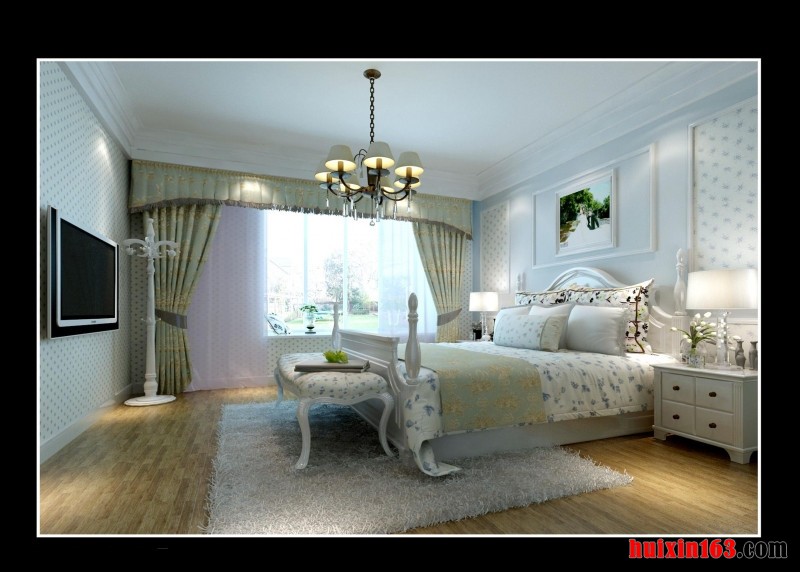 本套装修为田园型装修,卧室地面采用地板装修,局部采用的地毯进行装饰,墙面采用的墙纸进行装修,吊顶采用石膏板进行平顶吊顶,加以吊灯进行装饰,带有小碎花的床竟然会有小白兔,好大的一只,窝在上面是有多么幸福。它大眼瞪小眼,实在是可爱又好笑。一款白色的床幔云淡风轻地悬在床顶上,显得整洁素雅,笼罩在床头,保持床内的温度,很有现代韵味,整个房间流露出厚朴自然的格调。