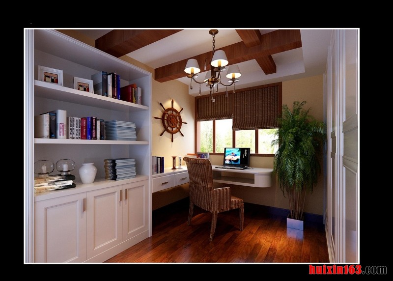 本套装修为现代简约型装修,书房地面采用地板装修,墙面采用的是墙纸进行装修,吊顶采用石膏板进行平顶吊顶,加以吊灯进行装饰,书房的书柜,总共分为三层,这里面主要放了平时要用的素材以及书籍,方面使用,同时其余的小装饰品作为点缀,白色的青花瓷,莹透的素颜,突出青花瓷的柔美清净质感。用藤编的座椅以及窗帘,冬暖夏凉,充满了原始自然的味道。营造出优雅舒适的氛围。