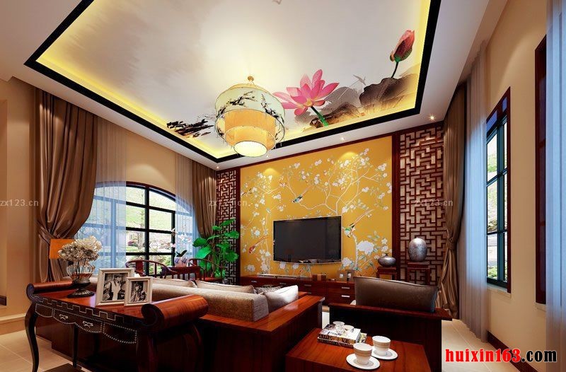 本套装修为中式古典型装修,客厅地面采用大理石装修,墙面采用墙纸进行装修,加以吊灯做装饰,吊顶上面一幅荷花。荷花看上去,给人一种雍容大气的感觉,想起了“接天连叶无穷碧,映日荷花别样红。”的诗句。典雅型的沙发,沙发对面的电视背景墙采用的一幅花的壁纸,两边勾勒出木式的门窗,给人以美观的视觉效果,拱形的玻璃窗户,既可以打开,也可以增加光线,看起来更具有美感。整个空间给人一种高雅神圣的感觉。